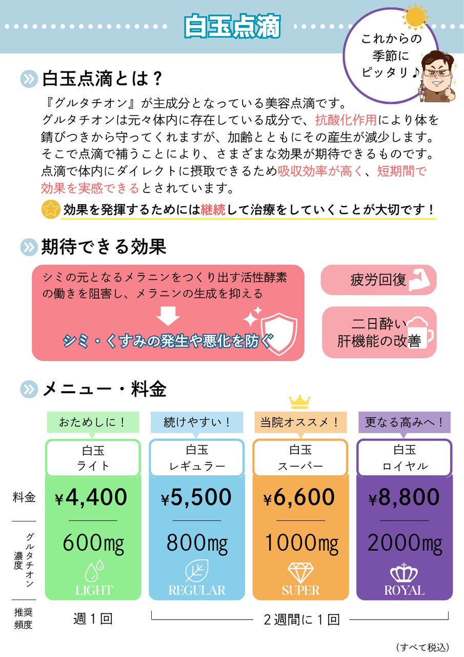 『グルタチオン』が主成分の美容点滴のことです。グルタチオンは元々は体内に存在している成分で、抗酸化作用により体を錆びつきから守ってくれますが、年齢とともに産生が減ります。そこで、点滴で補うことにより、さまざまな効果が期待できるものです。また、吸収効率が高く、短期間で効果を実感しやすいのもメリットです。