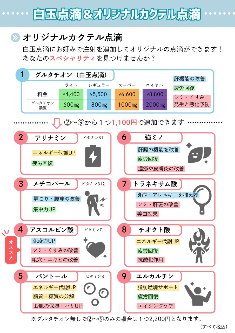 ※施術がなかった場合、カウンセリング料として1,100円(税込)をいただいております。カクテル点滴料金一覧